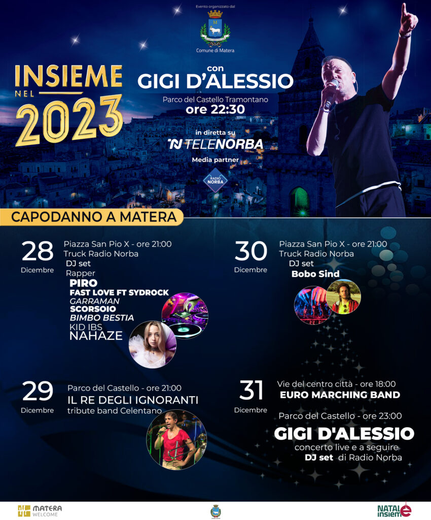 Durante il concerto di D’Alessio, che sarà trasmesso in diretta sull’emittente Telenorba, ci saranno diverse finestre con collegamenti su Canale 5 dal palco del Capodanno di Genova, presentato da Federica Panicucci, regina della notte di San Silvestro firmata Mediaset. Un’interessante vetrina nazionale da almeno sei milioni di visualizzazioni su Matera Capitale europea della cultura, perché le telecamere di Mediaset inquadreranno il parco e lo scenario della città, oltre al pubblico presente.