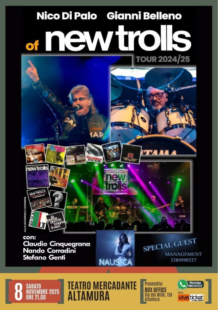 Inoltre, sabato 8 novembre il teatro ospiterà il concerto degli Of New Trolls, con Nico Di Palo e Gianni Belleno per un viaggio tra rock progressivo e la storia della band italiana leggendaria.