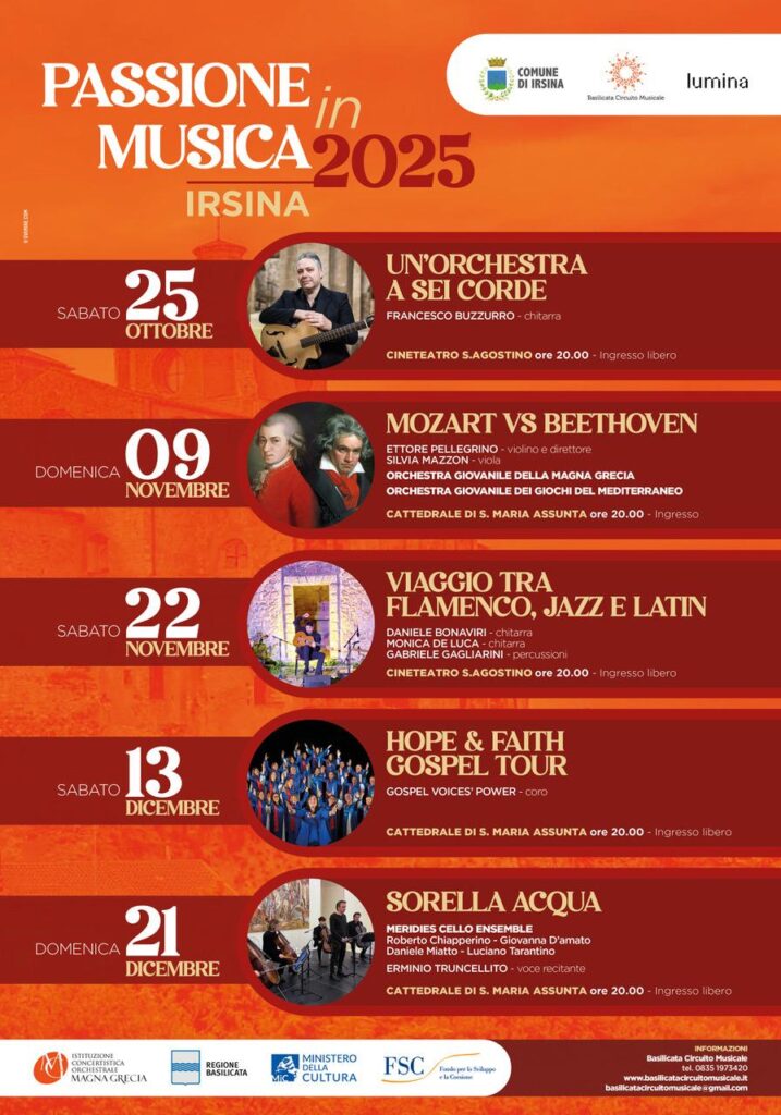 Irsina inaugura la stagione musicale autunnale con la rassegna “Passione in Musica 2025”, promossa da Basilicata Circuito Musicale in collaborazione con il Comune di Irsina e l’Orchestra della Magna Grecia, con il patrocinio della Regione Basilicata, del Ministero della Cultura e del Fondo per lo Sviluppo e la Coesione.