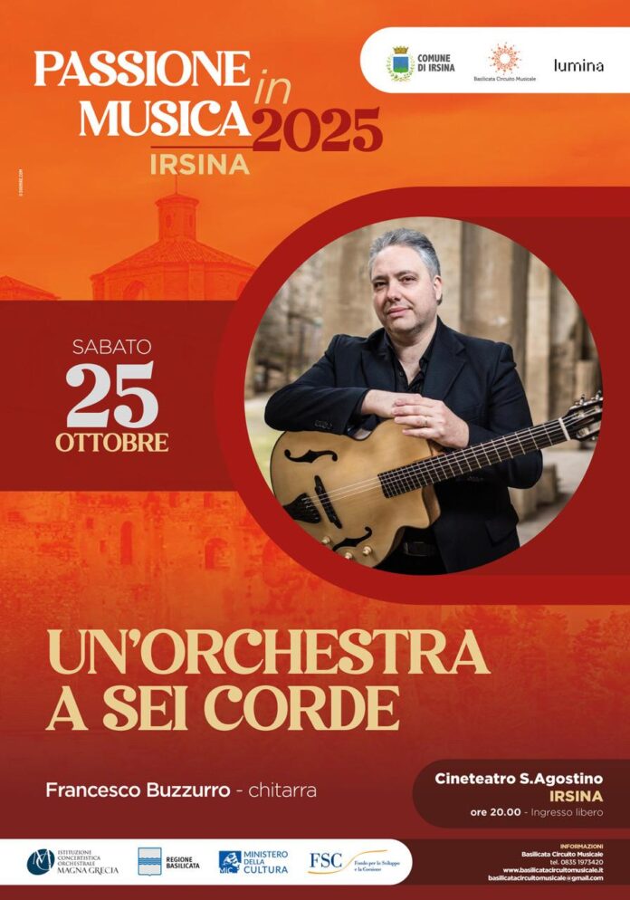 Il primo concerto si terrà sabato 25 ottobre alle ore 20:00 al Cineteatro Sant’Agostino con “Un’Orchestra a sei corde”, esibizione del celebre chitarrista Francesco Buzzurro, noto a livello internazionale per la sua tecnica e sensibilità artistica.
