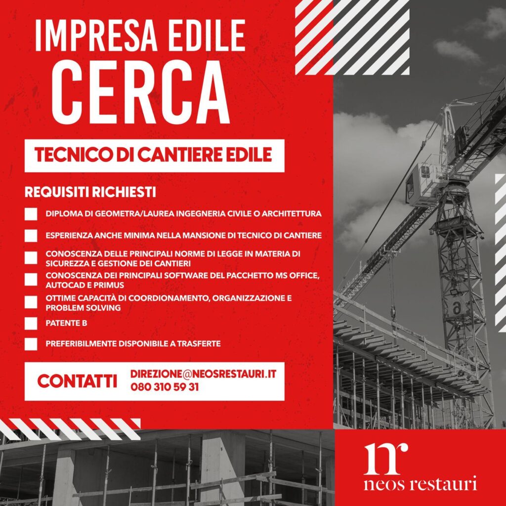 Neos Restauri S.r.l., impresa edile specializzata in restauro conservativo, beni culturali, edilizia civile e industriale con sede ad Altamura (BA), cerca urgentemente un tecnico di cantiere edile. L’annuncio richiede diploma di geometra o laurea in ingegneria civile/architettura, esperienza come capocantiere e disponibilità a trasferte su tutto il territorio nazionale.