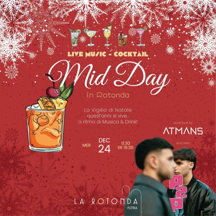 La Pizzeria La Rotonda di Altamura propone un christmas happy hour unico per la Vigilia di Natale: martedì 24 dicembre 2025, dalle 11:30 alle 15:30, il locale si trasforma in un punto di incontro tra gusto, musica e divertimento. DJ set live di Atmans & P2P, piano bar e live music saranno accompagnati da cocktail e drink speciali, perfetti per brindare all’arrivo delle feste.