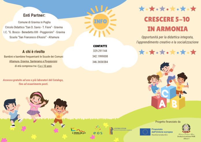 Il Comune di Gravina avvia il progetto “Crescere 5-10 in Armonia”, percorso educativo gratuito per bambine e bambini dai 5 ai 10 anni grazie ai fondi dell’Unione Europea-PNRR. Gli enti attuatori sono le cooperative sociali L’Aquilone 2015, Eos e il Centro Studi Don Luigi Sanseverino Gramegna.
