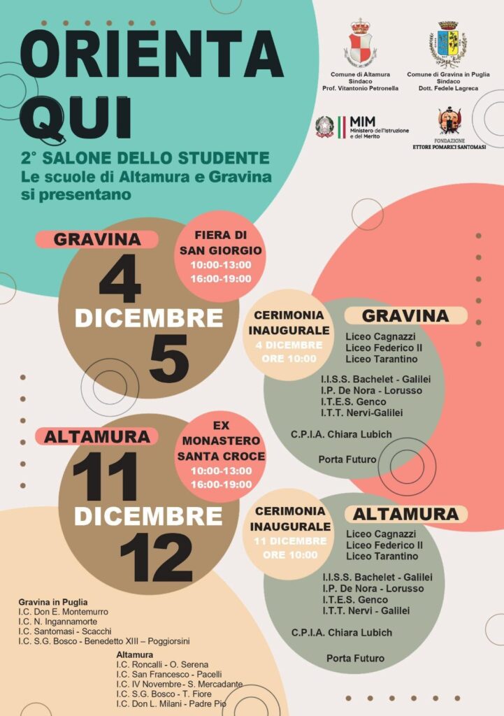 Dopo la tappa dei giorni scorsi a Gravina, l’appuntamento ad Altamura propone due giornate ricche di incontri, spettacoli, innovazione e presentazione di programmi didattici, per aiutare ragazze e ragazzi a scegliere in modo più consapevole il proprio percorso di studi. L’Amministrazione comunale ha sostenuto con convinzione il progetto, mettendo a disposizione i servizi di stampa dei materiali, il trasporto scolastico, la pulizia degli spazi e l’utilizzo del bene pubblico dell’ex Monastero di Santa Croce.