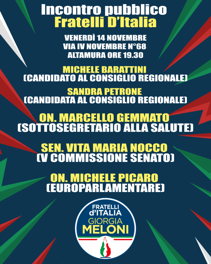 ALTAMURA – Venerdì 14 novembre, alle ore 19:30, presso il comitato elettorale di Via IV Novembre n.68 ad Altamura, si terrà un incontro pubblico promosso da Fratelli d’Italia in vista delle elezioni regionali pugliesi.