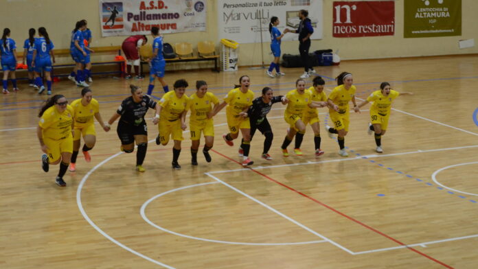 Le biancorosse sono partite con il piglio giusto, costruendo un buon possesso palla e mostrando aggressività in fase di pressione. Al 9’’, un calcio d’angolo favorevole ha permesso a Cataldo di intercettare una giocata, rubare palla a centrocampo e segnare il gol del vantaggio: 1-0 per Altamura.